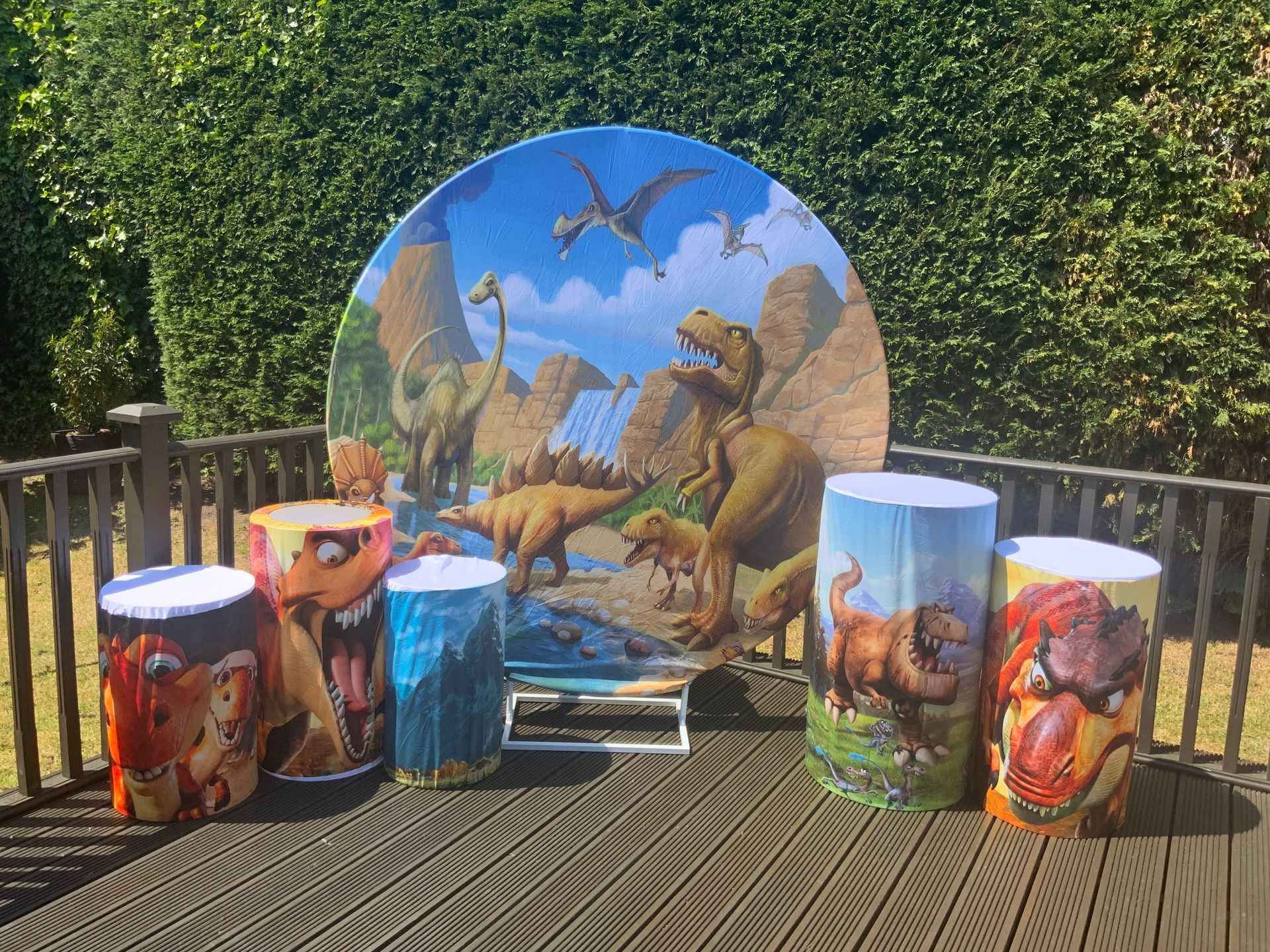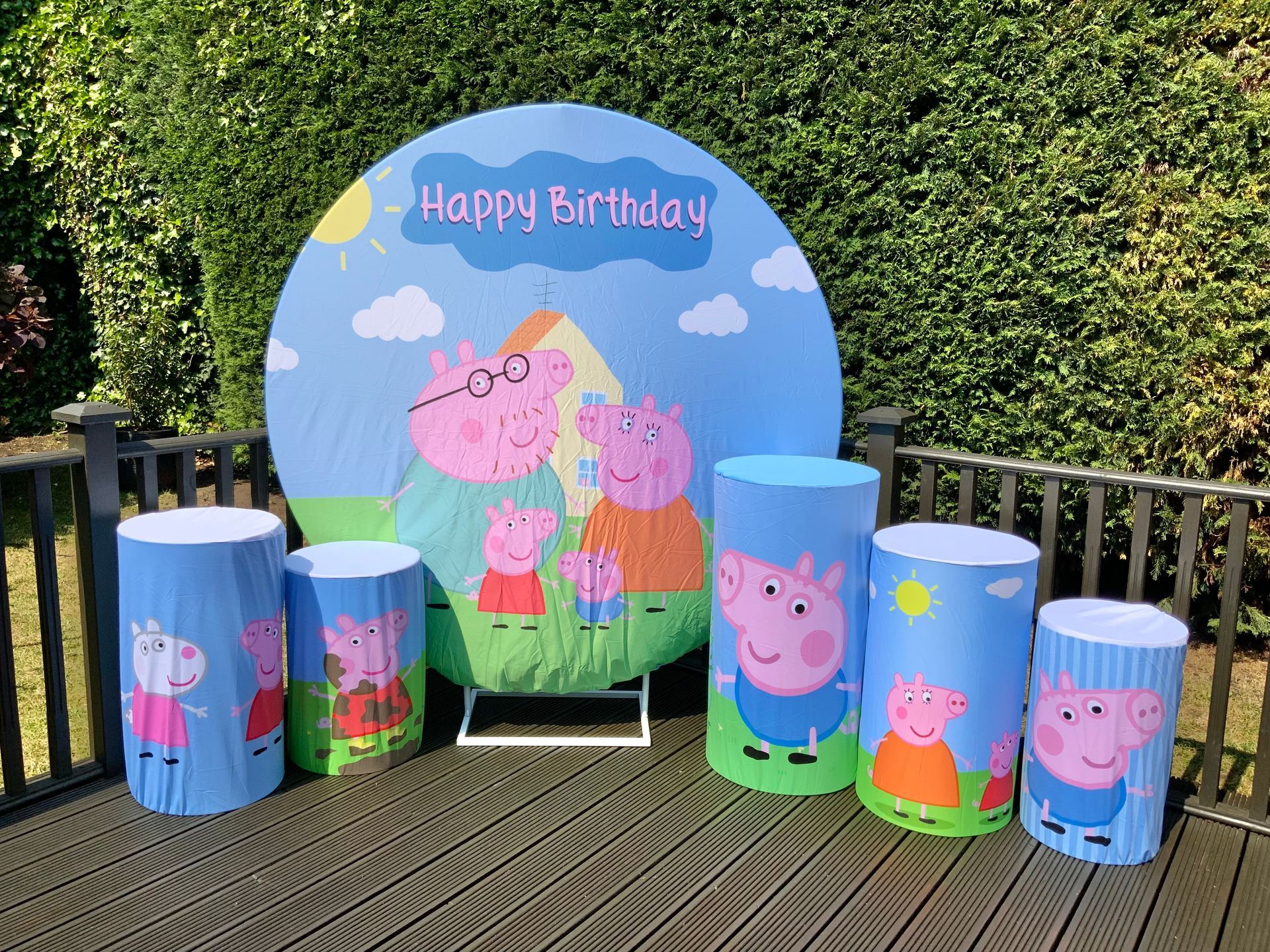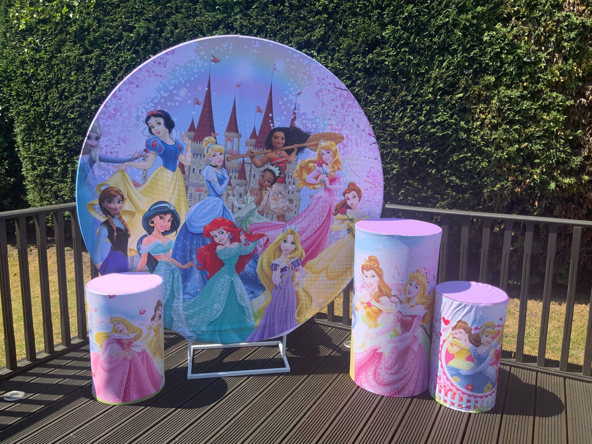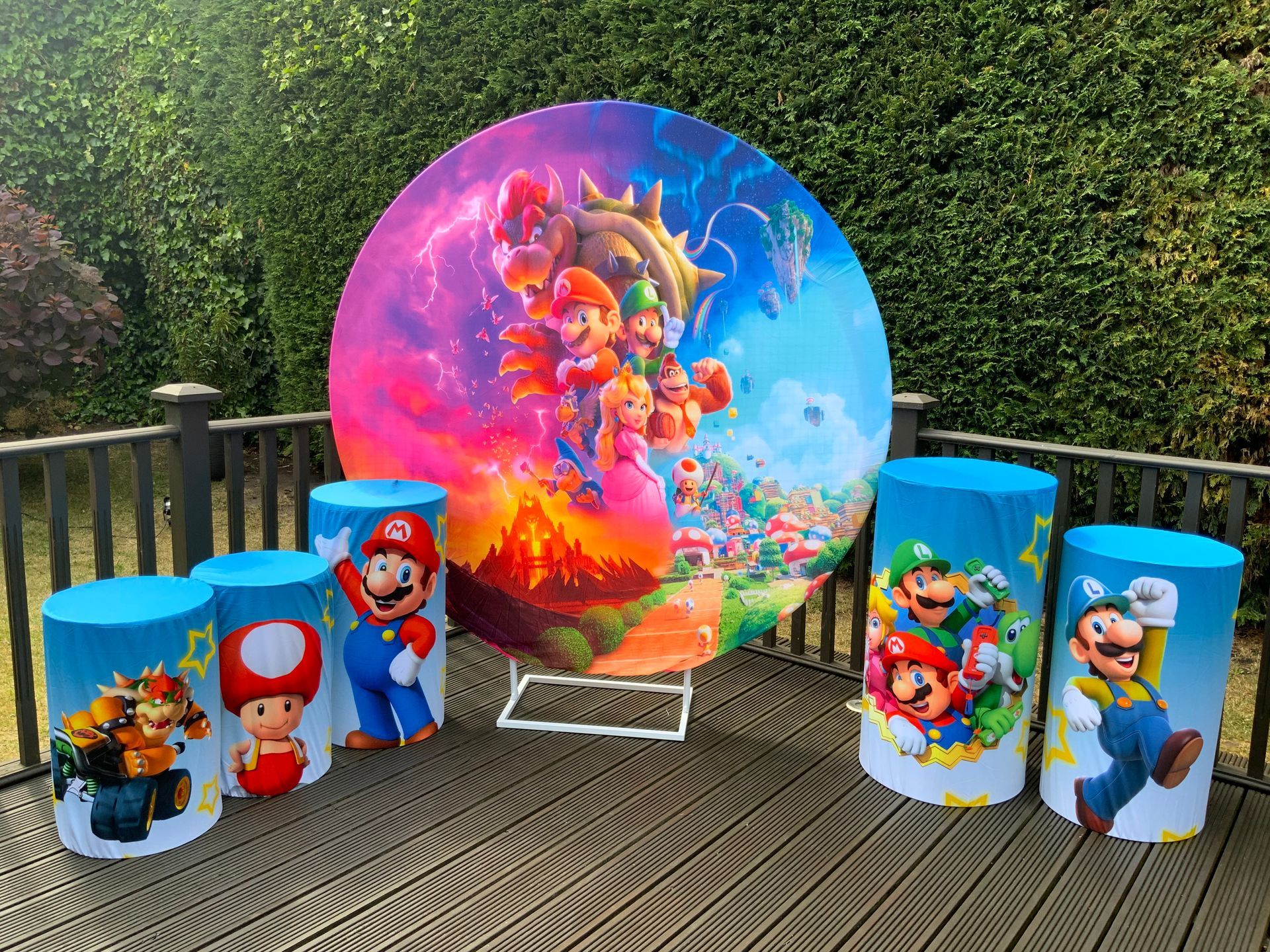 Our themes look absolutely stunning and will totally transform the space. The 6ft circle background is accompanied by 5 podium stands. Clients typically use the backdrop as their main photo area.