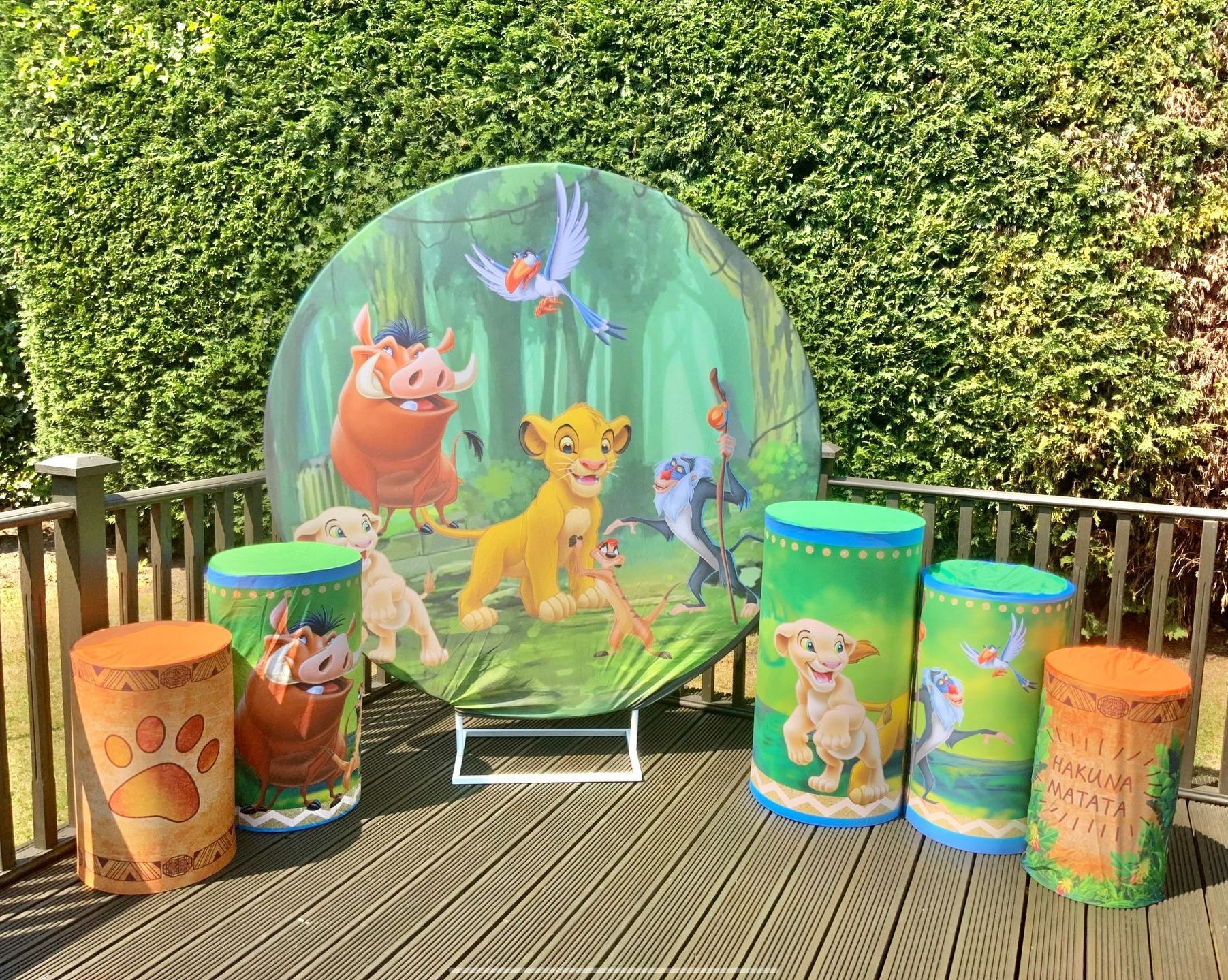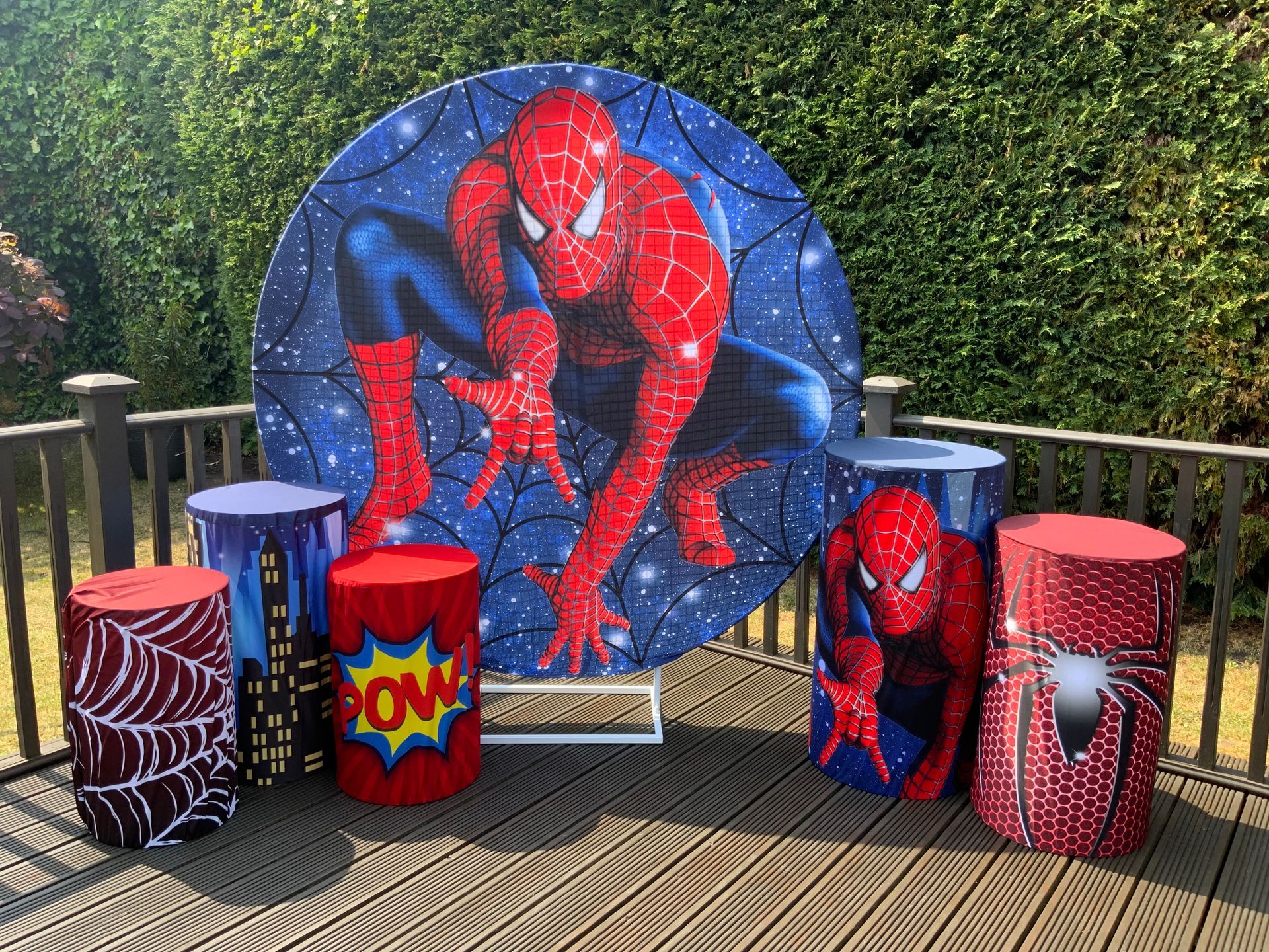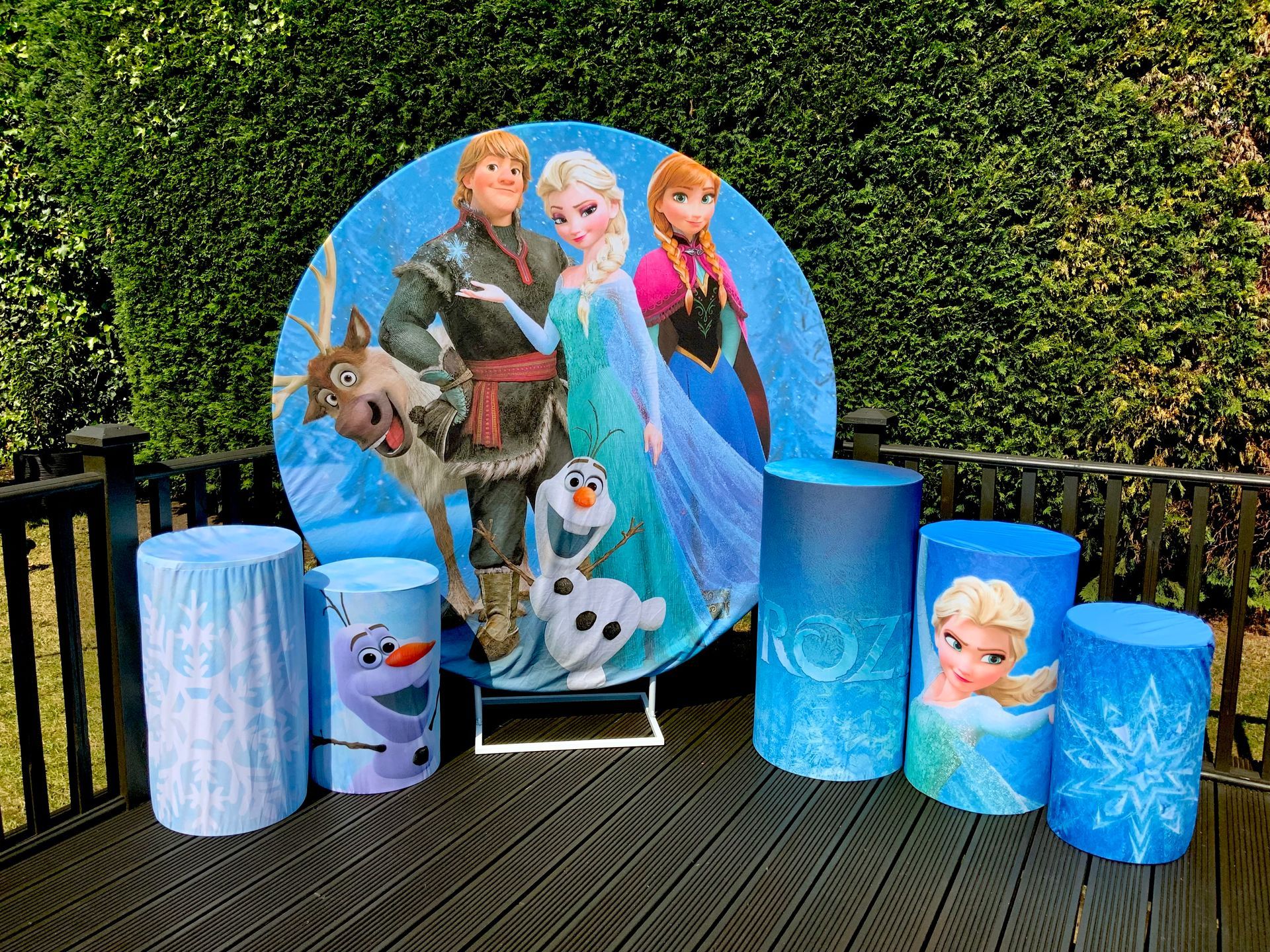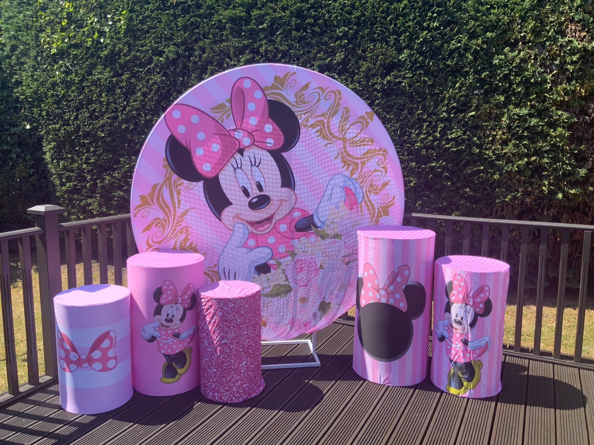 Our themes look absolutely stunning and will totally transform the space. The 6ft circle background is accompanied by 5 podium stands. Clients typically use the backdrop as their main photo area.