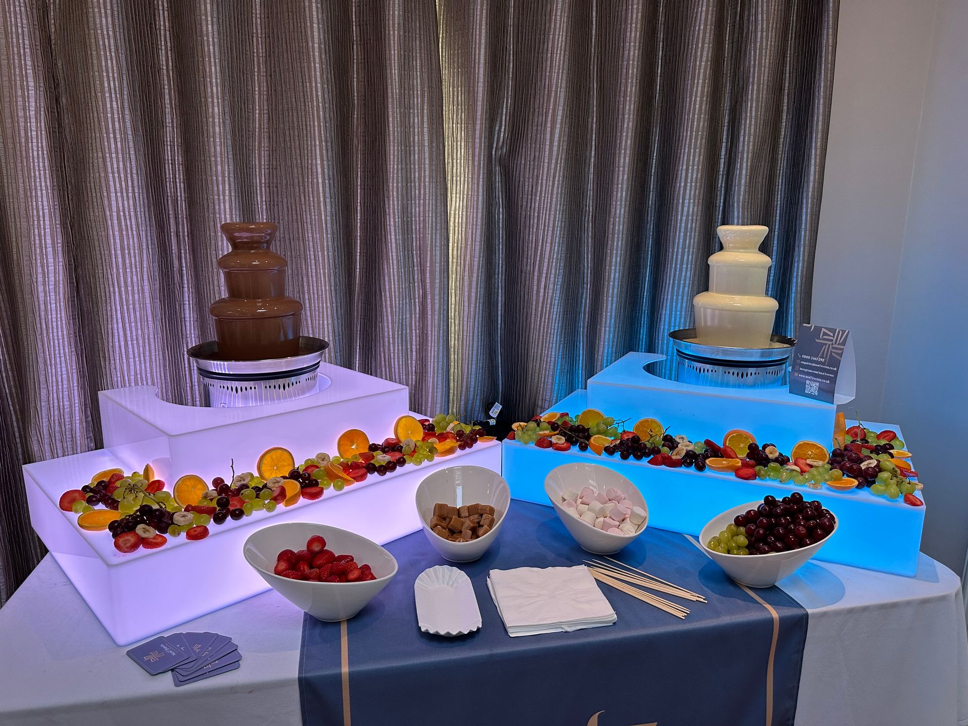 Our inventory also includes ‘The Twin Fountains’ which are two identical fountains, however clients generally prefer to have one flowing with white Belgian chocolate and the other with brown Belgian chocolate, which not only offers guests more choice but also adds to the visual impact. There is also a much bigger chocolate fountain available.