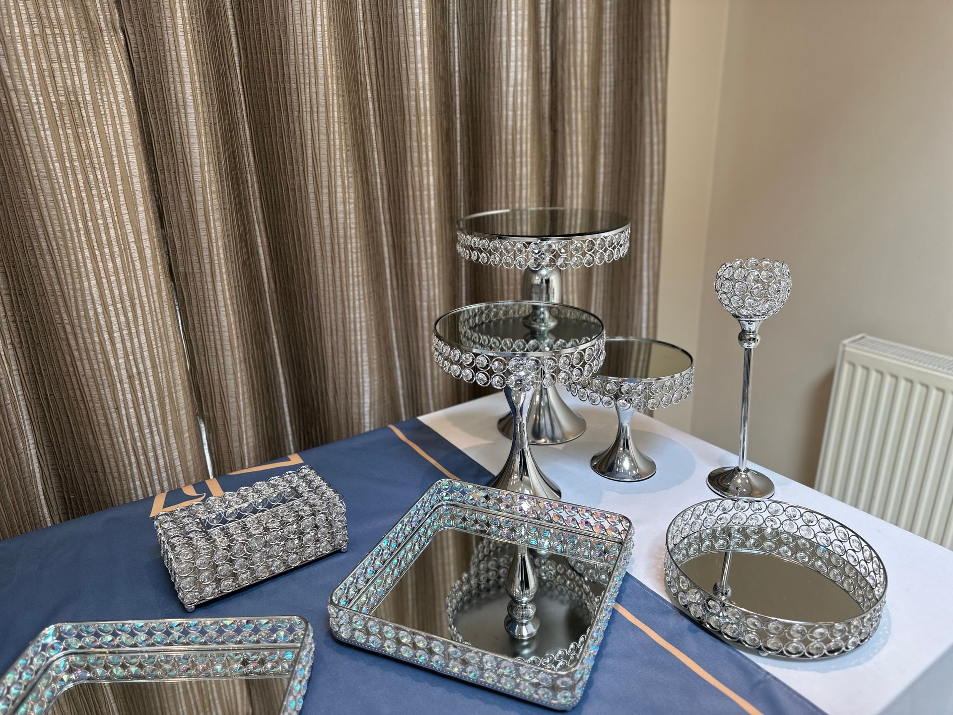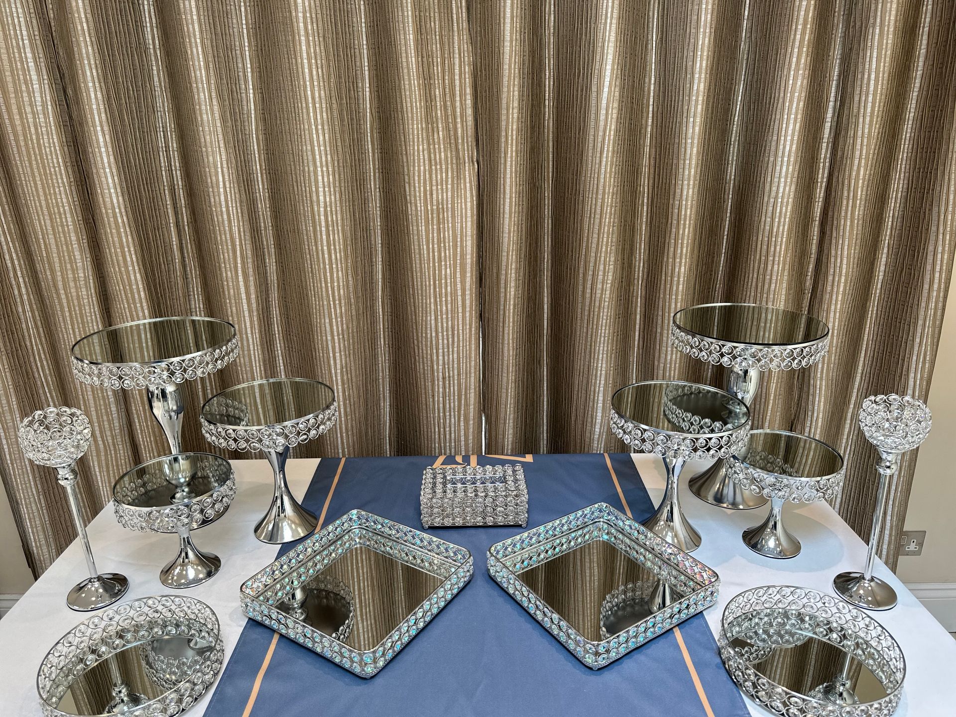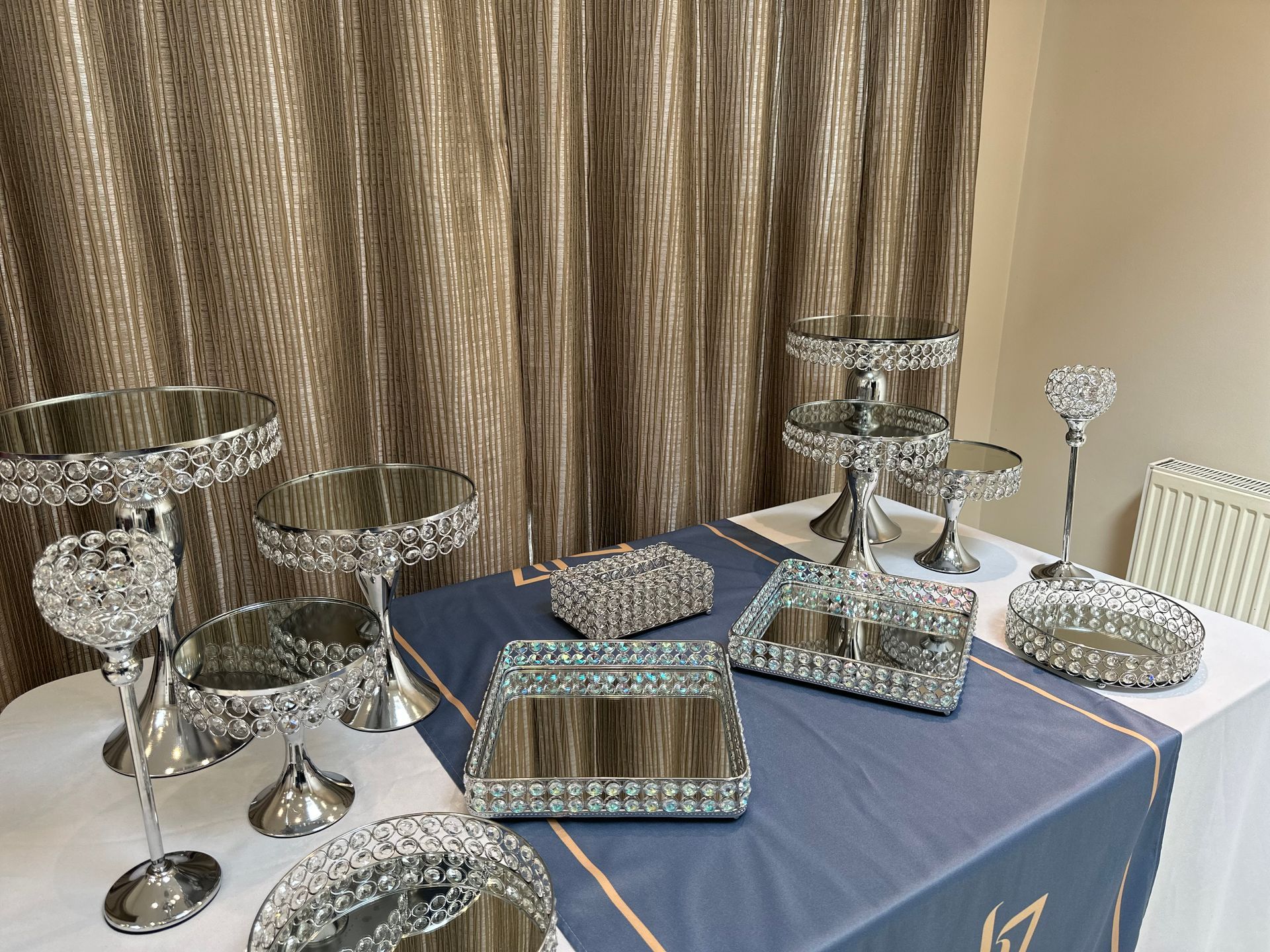 Our dessert stands are an elegant way of displaying food and drink at any event. The sides of the stands have been designed to create a diamond effect and when placed under light the diamonds sparkle to create a stunning visual effect. Clients often use the stands for cupcakes, small delicacies and dry foods. The stands are completed with napkin holders and tall tealight candle holders. The stands are available in rose gold and silver.
