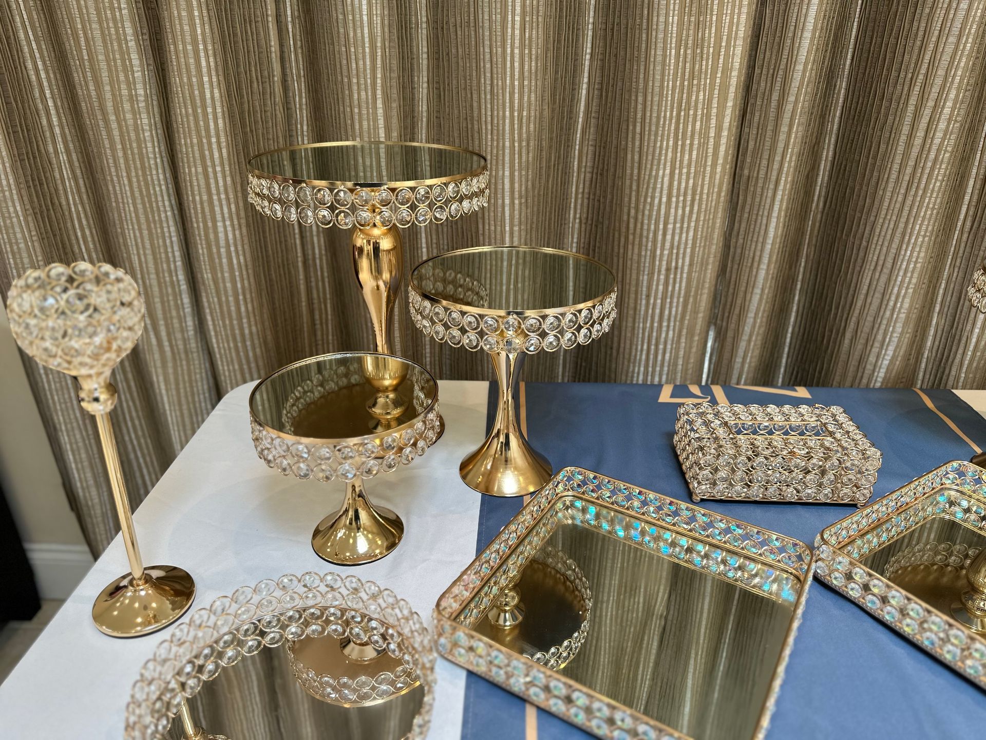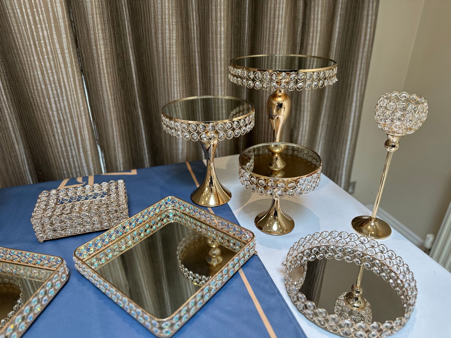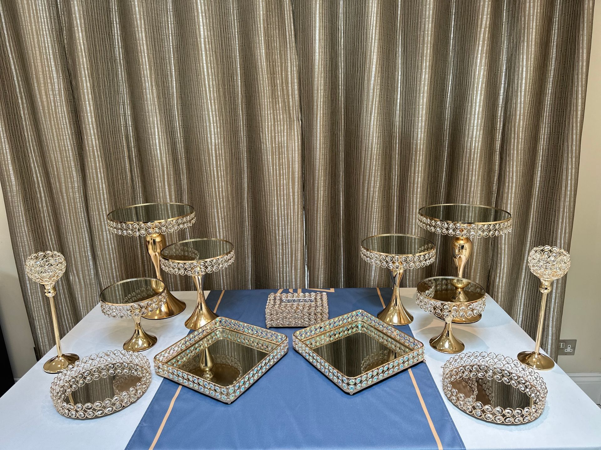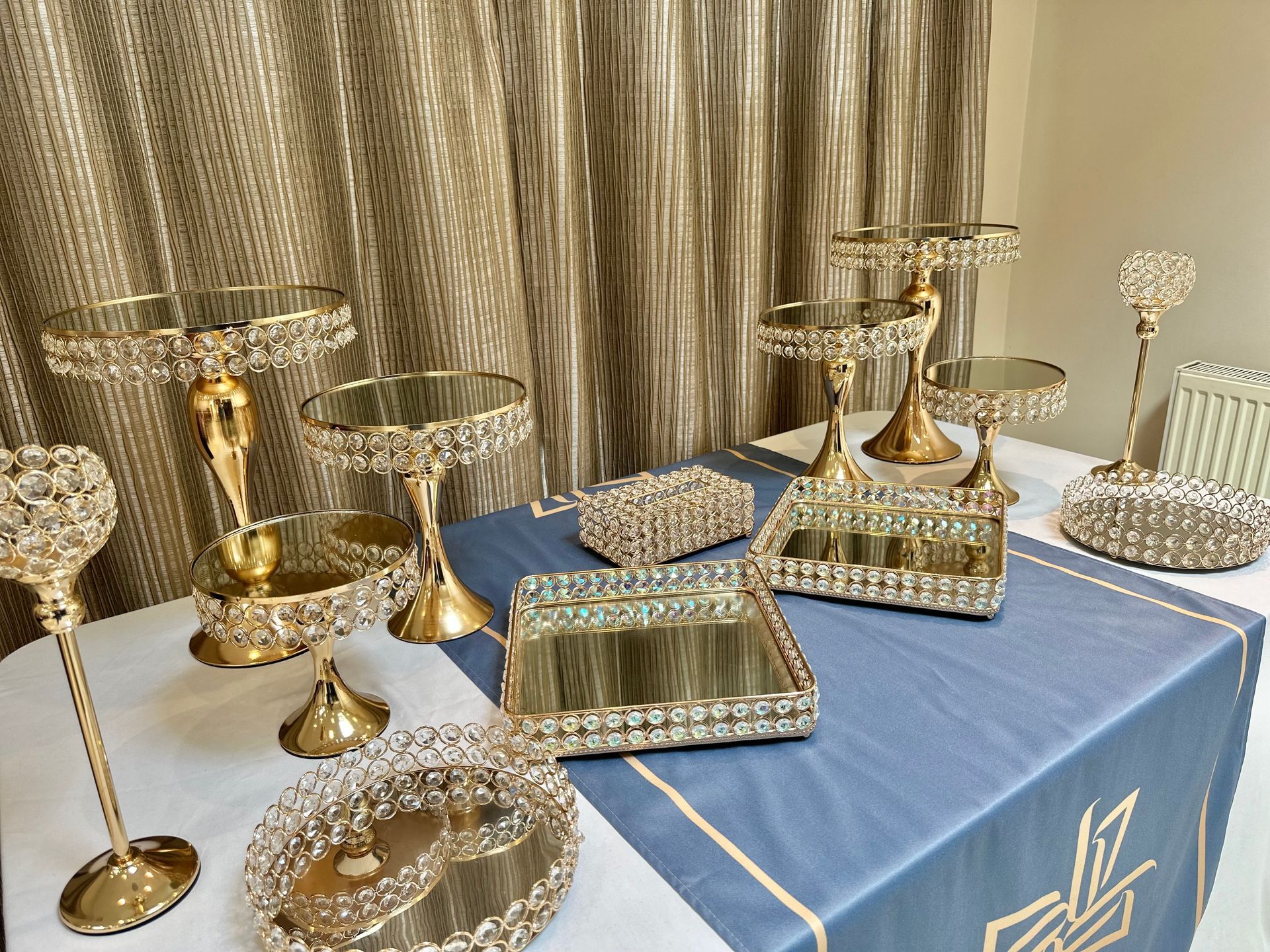 Our dessert stands are an elegant way of displaying food and drink at any event. The sides of the stands have been designed to create a diamond effect and when placed under light the diamonds sparkle to create a stunning visual effect. Clients often use the stands for cupcakes, small delicacies and dry foods. The stands are completed with napkin holders and tall tealight candle holders. The stands are available in rose gold and silver.