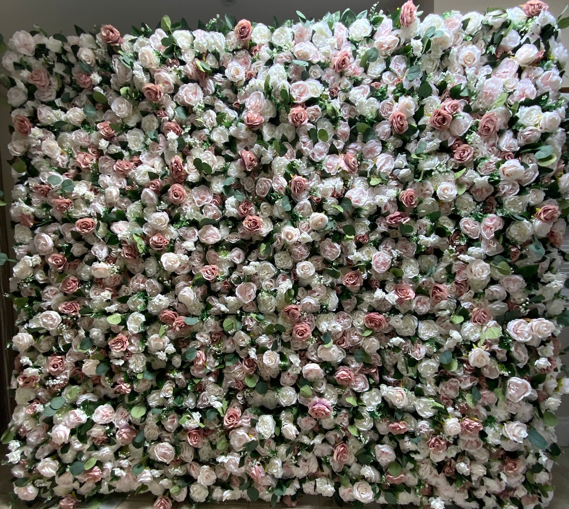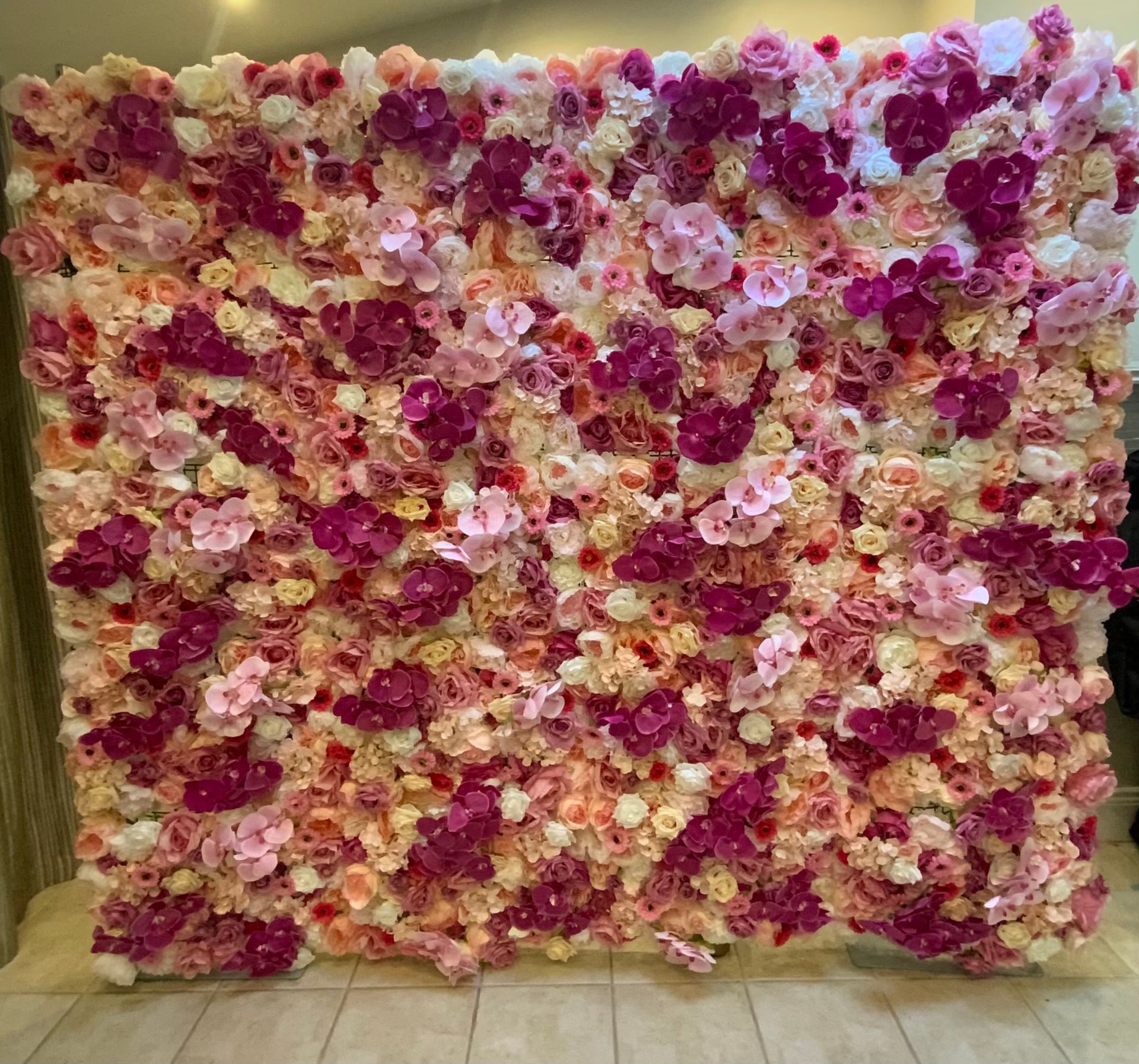 Each silk flower head has been carefully bound onto a panel at various heights. Once each panel has been connected, the flower wall creates a breath-taking 3D spectacle. The open air design allows for the scenic display to be placed almost anywhere.