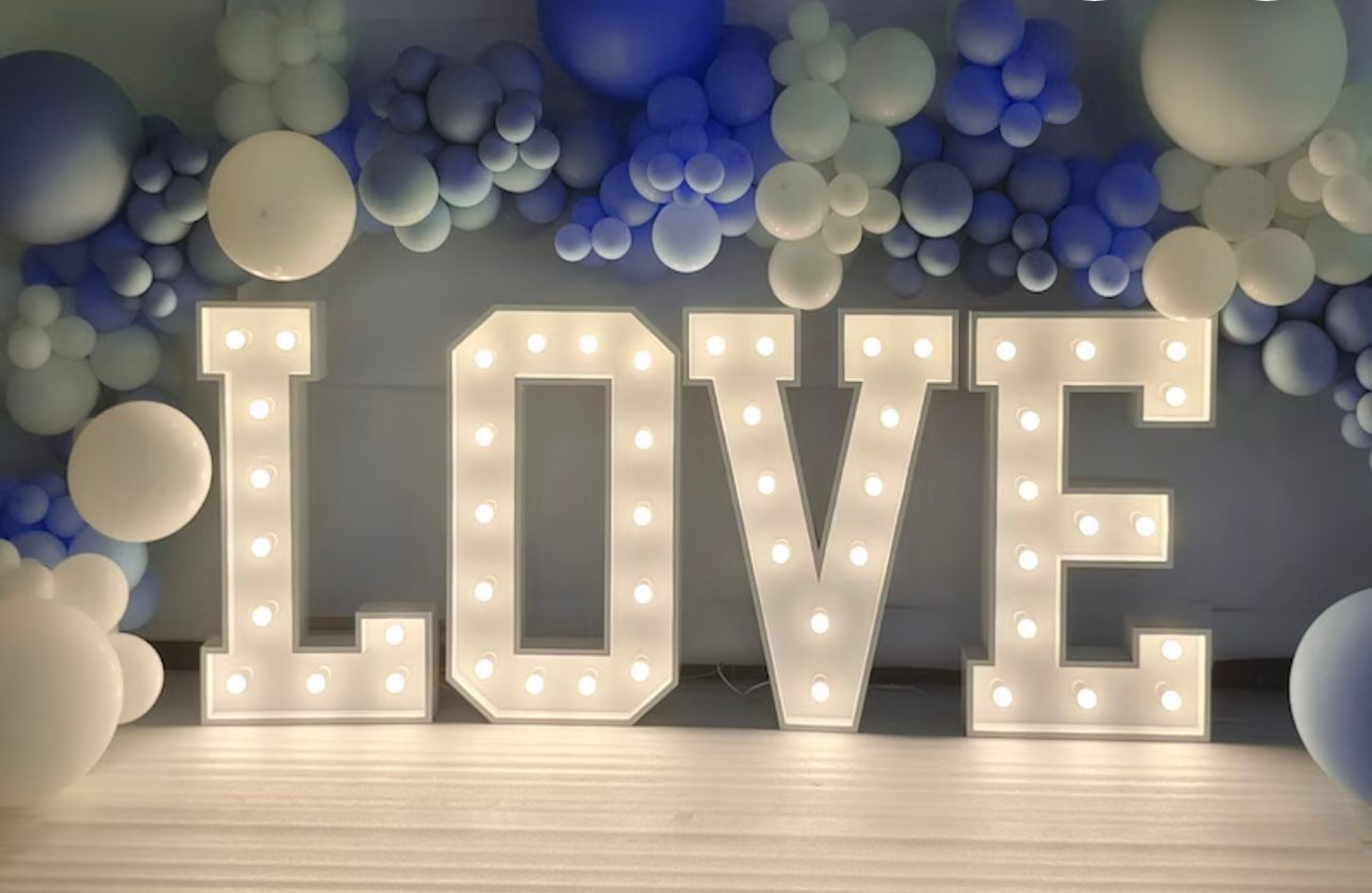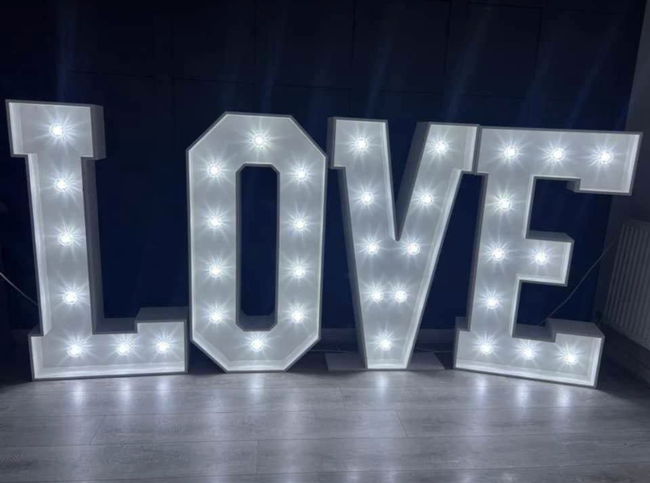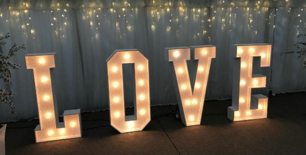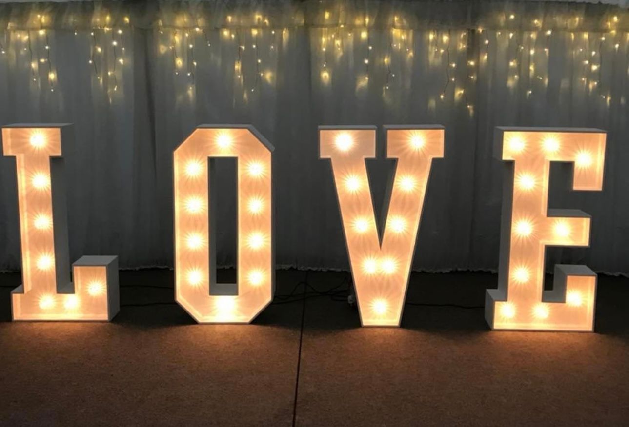 The free standing 5ft illuminated letters are hand made from reclaimed wood and fitted with cabochon style bulbs offering a stunning warm glow. The classic white finish presence elegance and highlights the reason your guests have all gathered - to celebrate love!